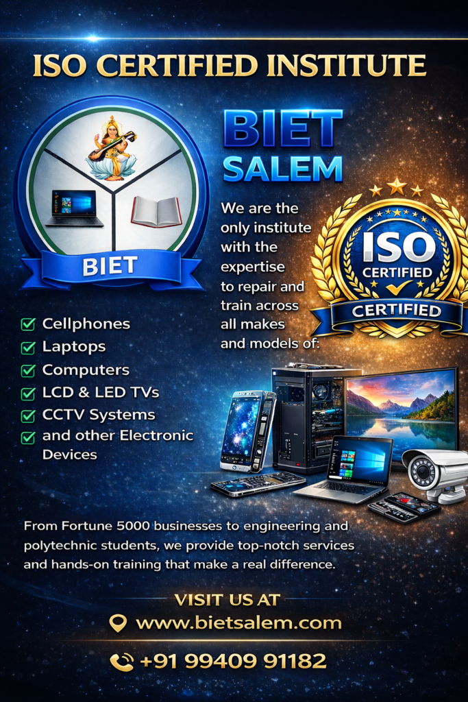At BIETSALEM, we take pride in being the only institute that specializes in repairing and training for all makes and models of Cellphones, Laptops, Computers, LCD & LED TVs, CCTV systems, and various electronic products. Our courses are designed for students, professionals, and businesses, ensuring hands-on expertise and in-depth knowledge in the latest repair technologies.